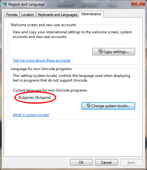 ПС Говориш ми за "non-unicode programs language", който си е на почти същото място като в XP, за разлика от шрифтовете на интерфейсаstoar08 написа: Прегледах няколко пъти всички регионални настройки, пробвах 3-4 шрифта (от които послендия е Arial Cyr). В режим на съвместимост, с администраторски достъп, без допълнителни екстри - няма промяна.